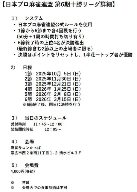 【日本プロ麻雀連盟】第6期十勝リーグ(プロアマリーグ) 第4節 2026年1月25日(日) 会場:麻雀サロンかっぱ